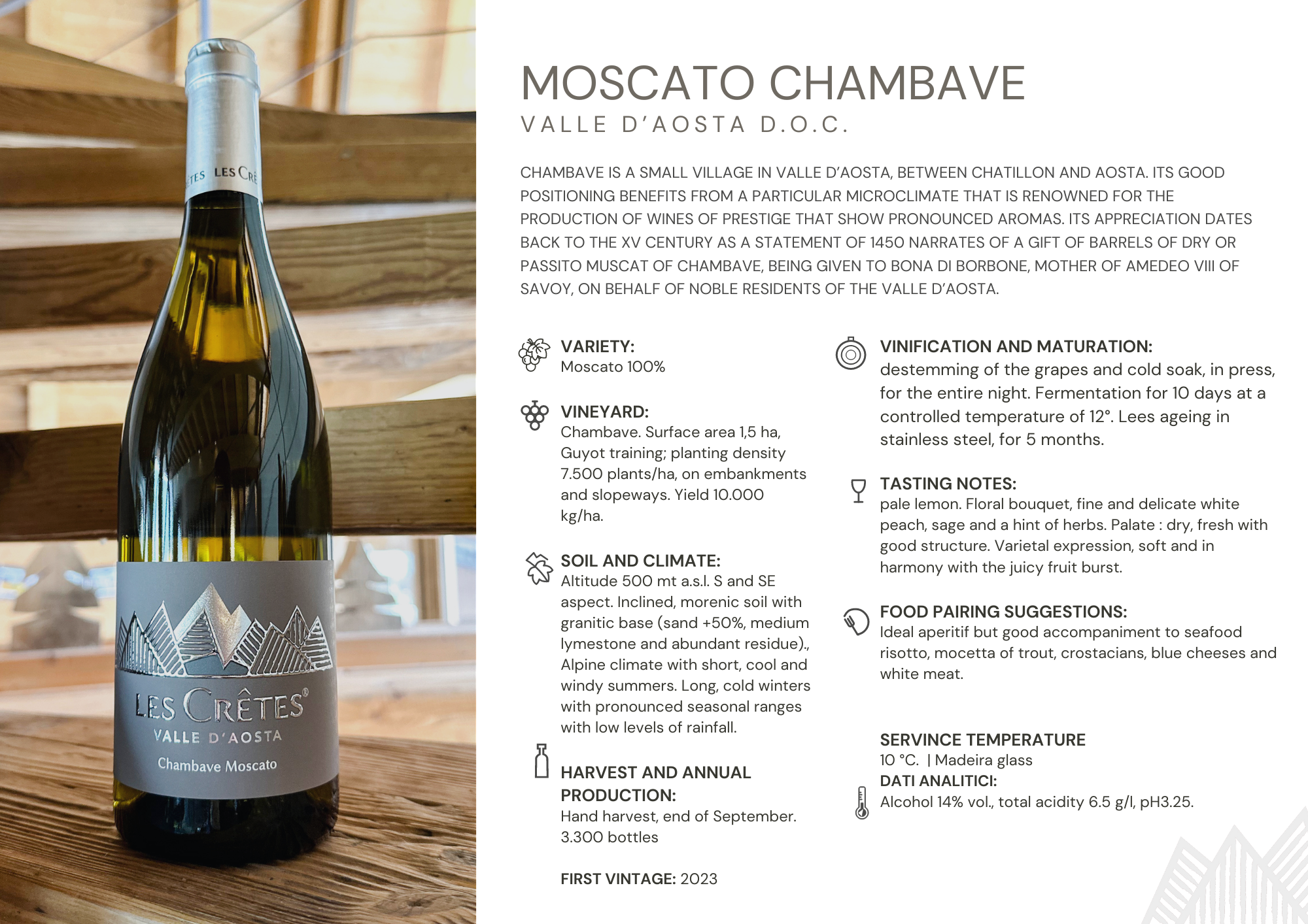 Chambave est un petit village de la vallée d’Aoste, situé entre Châtillon et Aoste. Sa situation favorable bénéficie d’un microclimat particulier, réputé pour la production de vins prestigieux aux arômes prononcés.