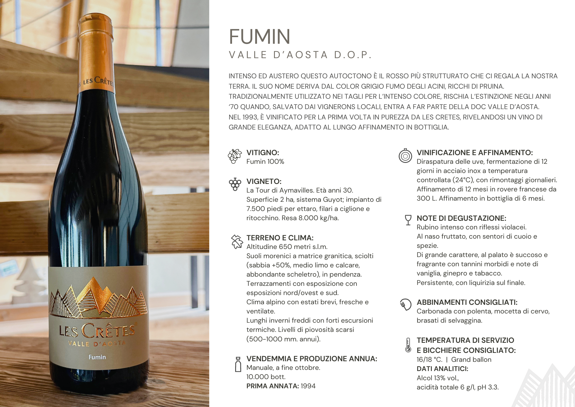 Tradizionalmente utilizzato nei tagli per l’intenso colore, rischia l’estinzione negli anni ’70 quando, salvato dai Vignerons locali, entra a far parte della Doc Valle d’Aosta. Nel 1993, è vinificato per la prima volta in purezza da Les Crêtes, rivelandosi un vino di grande eleganza, adatto al lungo affinamento in bottiglia.