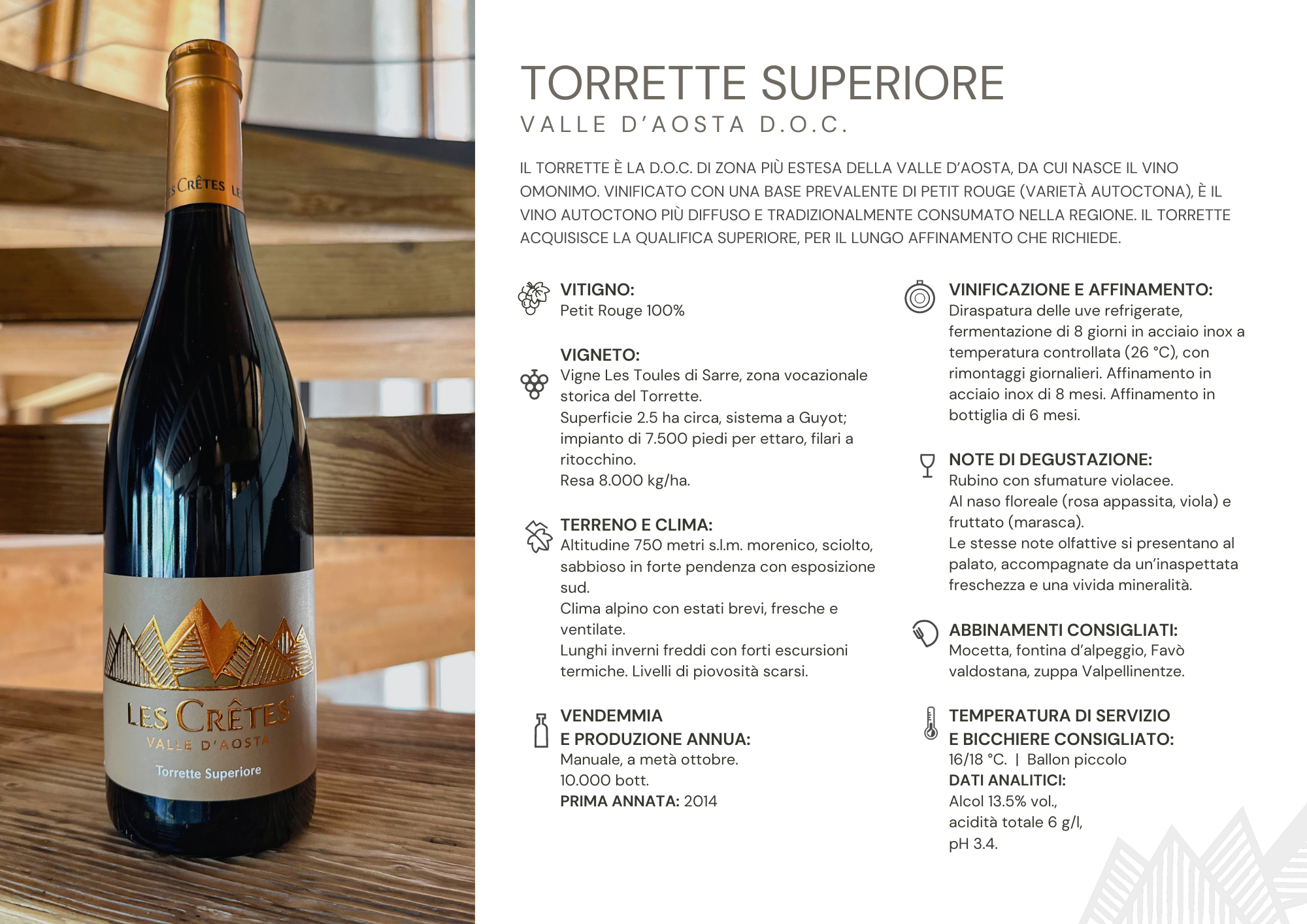 Il Torrette è la D.O.C. di zona più estesa della Valle d’Aosta, da cui nasce il vino omonimo. Vinificato con una base prevalente di Petit Rouge (varietà autoctona), è il vino autoctono più diffuso e tradizionalmente consumato nella regione.